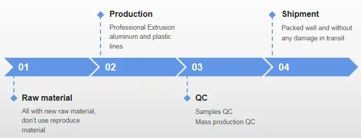Ως επαγγελματίας κατασκευαστής προφίλ αλουμινίου LED και πλαστικού προφίλ LED, η JE επικεντρώνεται πάντα στην πιστοποίηση προϊόντων από αλουμίνιο και πλαστικές πρώτες ύλες έως τη γραμμή παραγωγής εξώθησης, από ποιοτικό έλεγχο δειγμάτων έως έλεγχο μαζικής παραγωγής, από ισχυρή τέλεια συσκευασία έως ολοκληρωμένη εξυπηρέτηση.